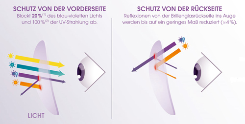 Crizal Prevencia vereinigt die Vorteile einer sehr hochwertigen Entspiegelung und Antikratzbeschichtung mit Lotuseffekt, mit perfektem Schutz vor gesundheitsschädlichen Lichtstrahlen.